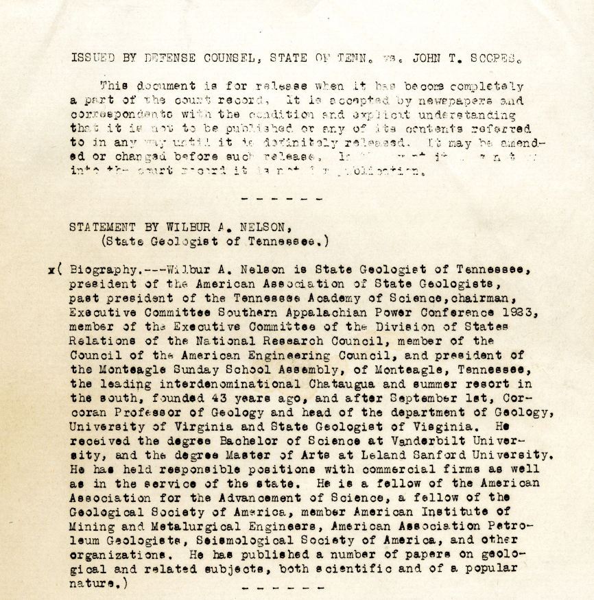 “Two experts had connections to the University of Virginia. Biology professor William Allison Kepner (1875-1971) was teaching in the summer session but willingly rearranged his classes to make himself available. Geologist Wilbur Armistead Nelson (1889-1969) was scheduled to join the Virginia faculty and become State Geologist of Virginia on September 1, 1925. Nelson had been State Geologist of Tennessee since 1918, was past president of the Tennessee Academy of Sciences, and was locally known as president of the Monteagle Sunday School Assembly, an interdenominational Chautauqua and summer resort established in the 1880s on the Cumberland Plateau above Dayton.”